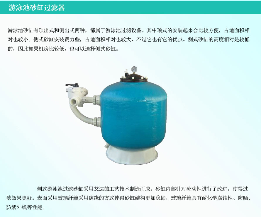 游泳池砂缸有頂出式和側(cè)出式兩種,都屬于游泳池過濾設(shè)備。其中頂式的安裝起來會比較方便,占地面積相對也較小。側(cè)式砂缸安裝費力些,占地面積相對也較大,不過它也有它的優(yōu)點。側(cè)式砂缸的高度相對是較低的,因此如果機房比較低,也可以選擇側(cè)式砂缸。